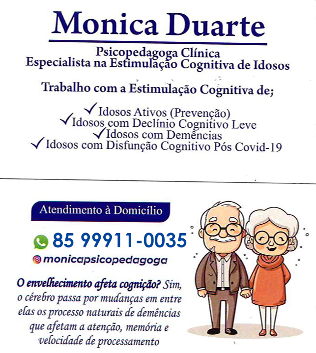 A AASPECE visando sempre as melhores parcerias em contato com Monica Duarte Psicopedagoga Clínica Especialista na Estimulação Cognitiva de Idosos Ativos, Idosos com Declínio Cognitivo Leve, Idosos com Demências e Idosos com Disfunção Cognitivo Pós Covid-19 traz para AASPECE serviços de importante valor.